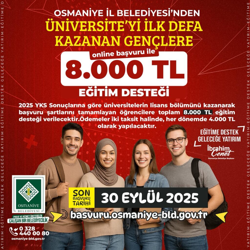 Başvuru Koşulları: • Osmaniye Merkez’de ikamet etmek • Üniversitelerin lisans bölümünü kazanmak